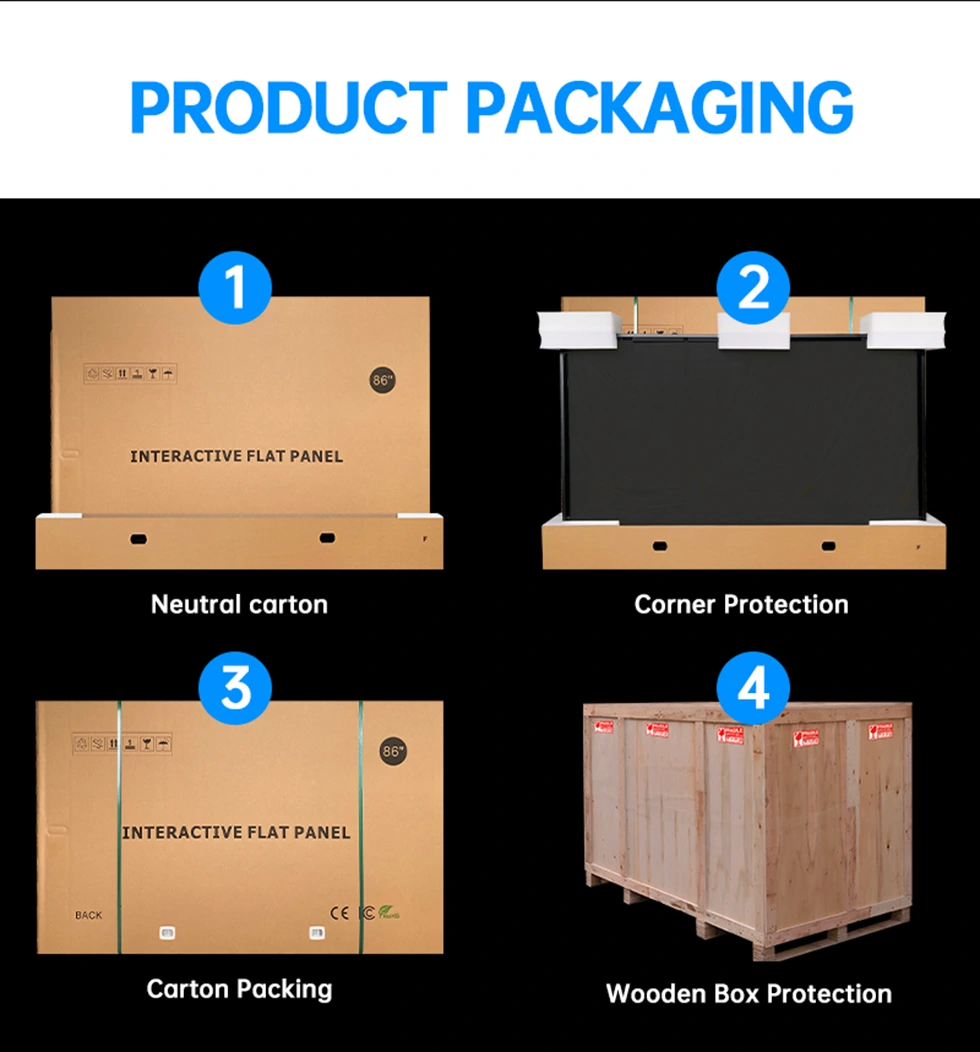 O monitor de tela plana interativo é embalado com segurança em uma caixa neutra com proteção reforçada de madeira para transporte seguro.