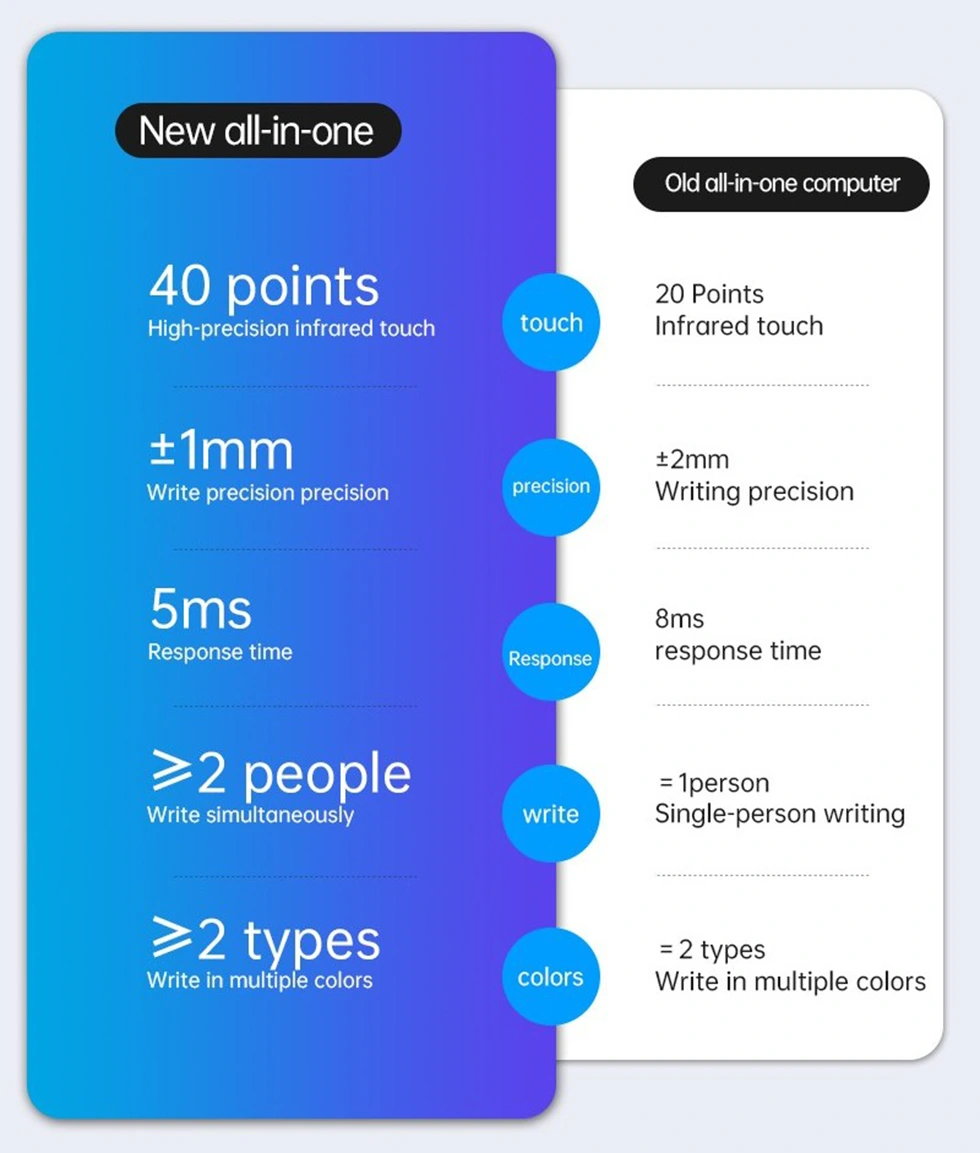 A avançada tecnologia de toque infravermelho promove uma colaboração perfeita com interação de toque altamente responsiva e precisa. Suporta colaboração multiusuário com 40 pontos de toque e controles de gestos intuitivos para zoom e navegação. A tecnologia também oferece configurações de caneta personalizáveis e um espaço de trabalho expansível para se adaptar às diversas necessidades profissionais.