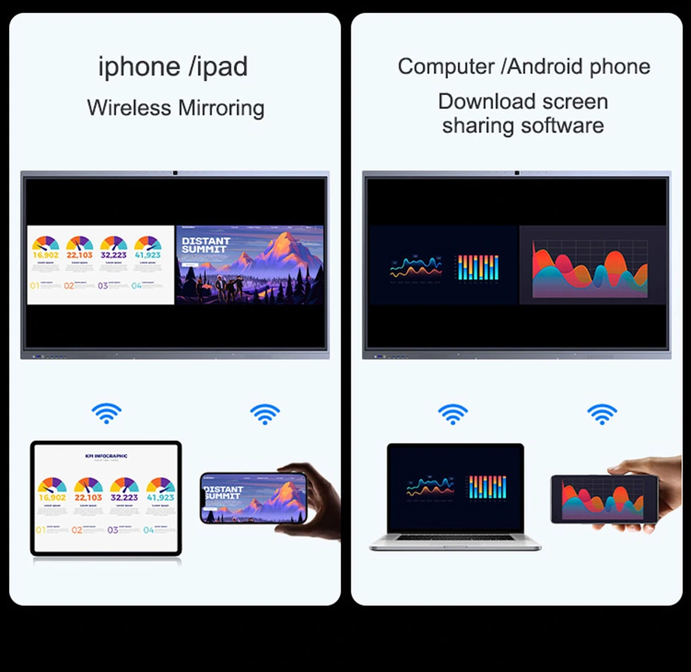Esta solução sem cabos oferece ampla compatibilidade de dispositivos e projeção nítida e sincronizada. Ele permite o compartilhamento de tela multiusuário com controle reverso interativo para compartilhamento contínuo de vídeos, músicas e documentos.